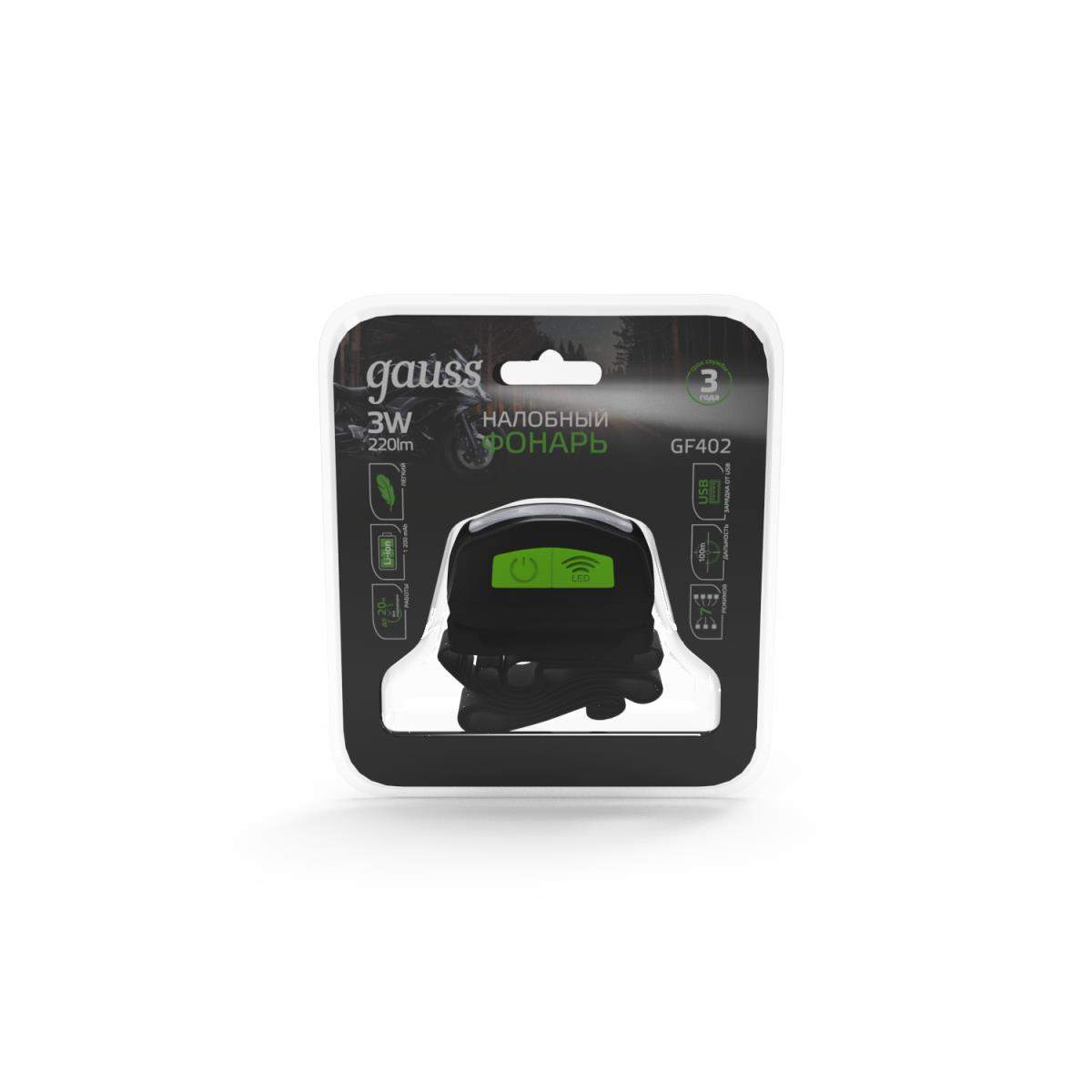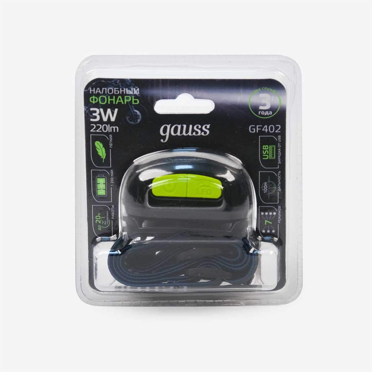 —Налобный светодиодный фонарь Gauss аккумуляторный 40х60 220 лм GF402 в Беларуси